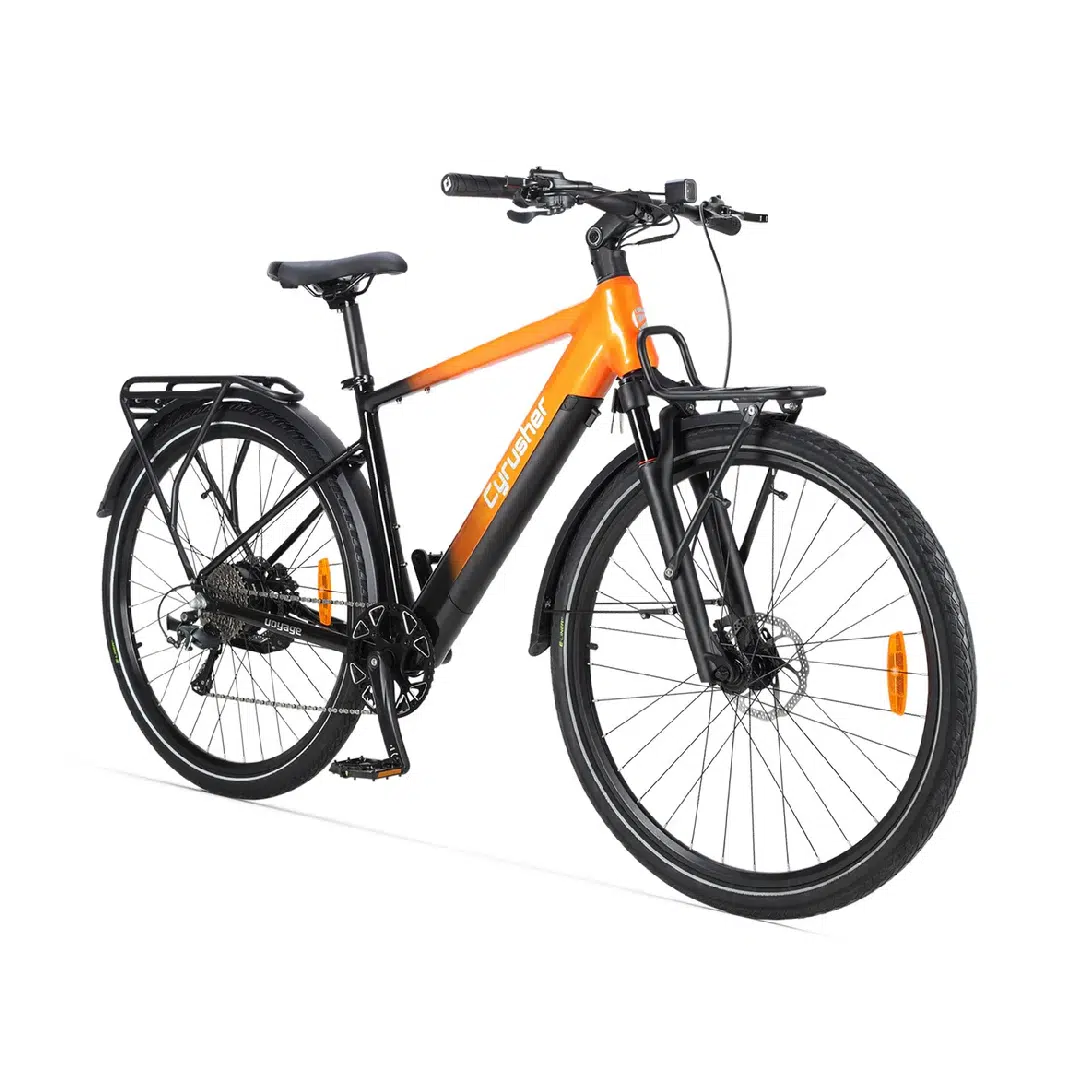 The Cyrusher Voyage Electric Bike is a sleek, high performance trekking electric bike designed for long commutes and extended touring adventures. Powered by a road legal 250W Bafang rear hub motor delivering 50Nm of torque, and guided by a torque sensor pedal assist system, it ensures a smooth and natural ride experience, ideal for both beginners and experienced cyclists. Its 36V 14Ah Samsung battery provides up to 75 miles of range per charge, offering long lasting reliability with a 5 to 7 hour charge time, perfect for daily commuting or weekend explorations.