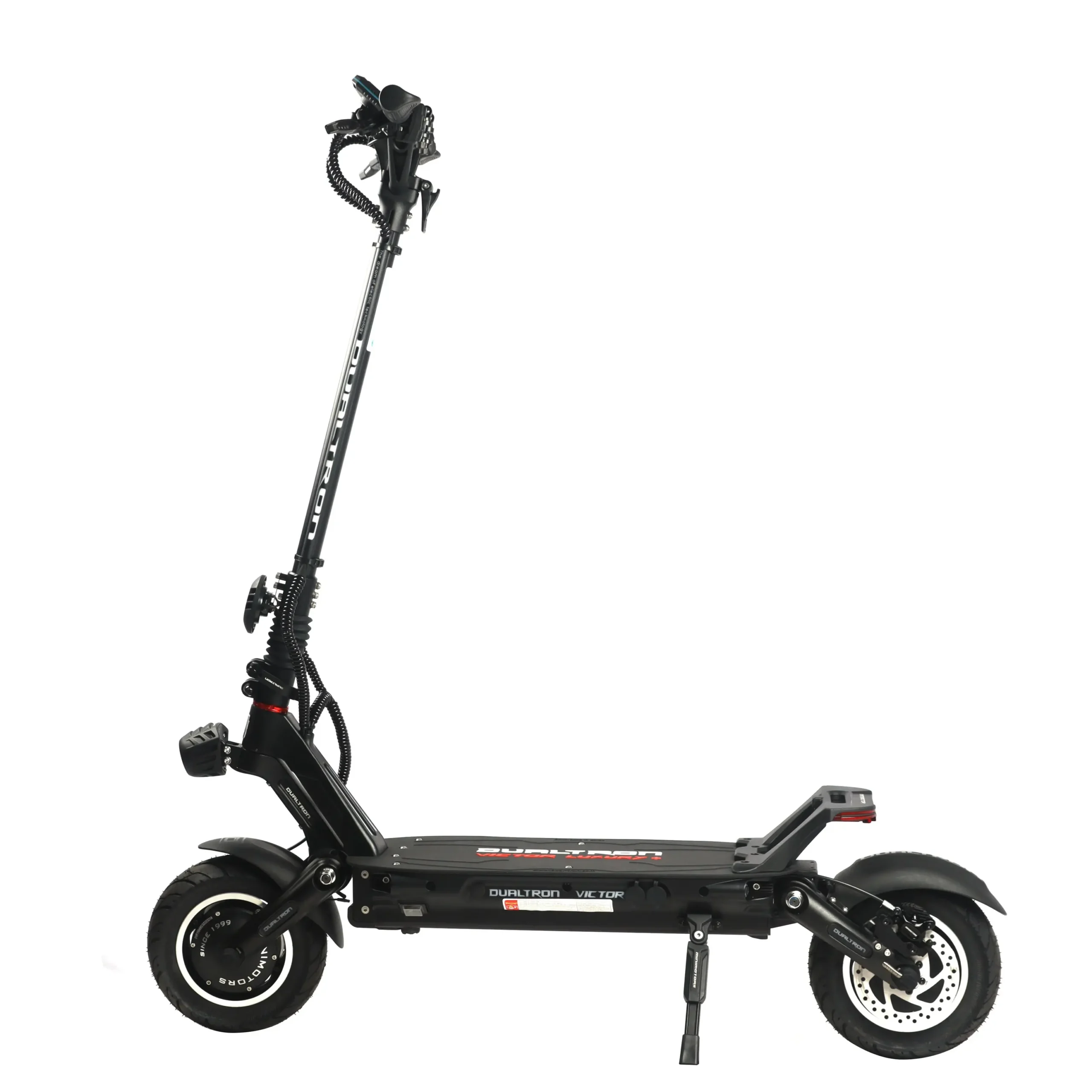 Every detail of the Victor Luxury Plus screams performance. The all-new EY4 LCD display with Bluetooth gives you real-time stats and lets you fine-tune your setup through a mobile app. Aggressive styling is matched with real-world functionality: a blazing headlight, integrated turn signals, horn, and customisable RGB lighting make sure youโre seen and heard. Built tough at 37.4 kg and ready to carry up to 120 kg, it folds down quickly with reinforced handlebars for transport or storage. If you’re looking for a scooter that doesnโt just perform but dominates, the Dualtron Victor Luxury Plus is your weapon of choice.