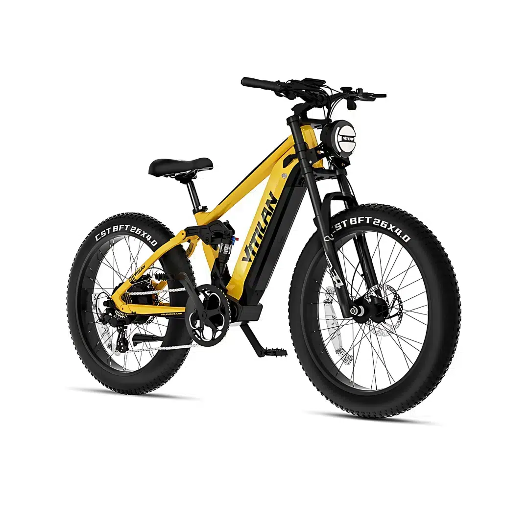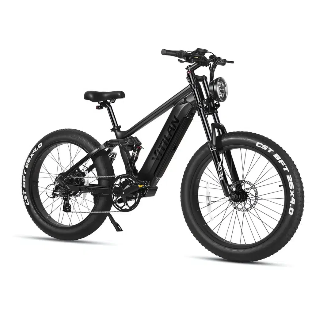Take your off-road adventures to the next level with the Vitilan T7 Pro Full Suspension Mountain E-Bike, built for thrill-seekers who crave power, performance, and durability. This high-performance electric bike is equipped with a 1000W (1600W Peak) brushless motor and a 52V 20Ah SAM-SUNG Li-ion battery, delivering impressive torque and a range of up to 80 miles per charge. The full suspension system, featuring hydraulic front forks and rear shock absorption, ensures a smooth and controlled ride even on the roughest terrains. With 26″ x 4.0″ fat tyres, the T7 Pro provides exceptional traction and stability, allowing you to conquer mountain trails, forest paths, and rocky landscapes with ease.